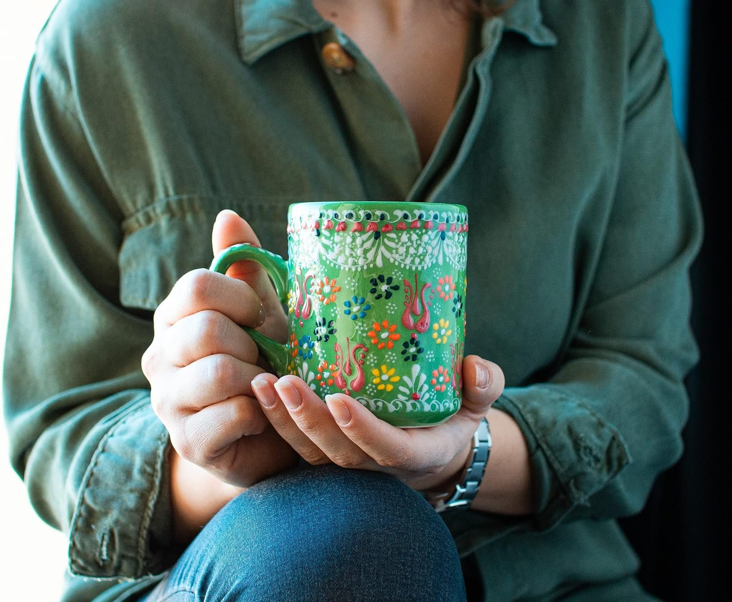 Custom Coffee Mug, 100% Handmade Green Ceramic Mugs With Handle