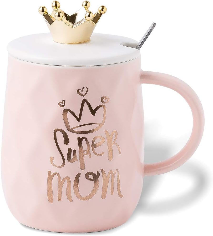Custom Mothers Day Gifts, Pink Cute Coffee Ceramic Cup, with Crown Lid & Spoon